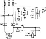 Блокувальні контакти контакторів КМ1 і КМ2 не допускають вмикання контакторів обох напрямків обертання двигуна при випадковому одночасному натисканні пускових кнопок SBI і SB 2.