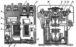 Рис. 3.3 . Магнітні пускачі 1 – стальна скоба, 2 – пластмасова колодка, 3 – осердя, 4 - пружина , 5 – котушка, 6 – головка, 7 – рухомий контакт, 8 – циліндрична контактна пружина, 9 – амортизаційна пружина, 10 - траверса , 11 – плоска пружина, 12 – мостик, 13 – пластина з нерухомим контактом, 14 – гвинт для приєднання проводів(шин) зовнішньої мережі