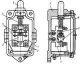 Для автоматичного вмикання, вимикання або перемикання електричних мереж в залежності від проміжного або кінцевого положень рухомих робочих органів верстата застосовують і кінцеві вимикачі. Вимикач рис. 3.4. має корпус 7 з кришкою 8, в якому на стійці 1 з діелектрика закріплені нерухомі 2 і рухомі мостикові 4 контакти.