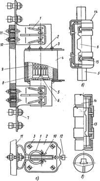 а - ПН з кварцовимнаповнювачем,б,в - ПР з патронами на струми 100 і 60 А; 1 - сталеві пружинячі кільця контактів, 2 - металеві кришки, 3 - гвинт, 4 - фарфоровий патрон, 5 - контактні ножі, 6 - плавкі вставки, 7 - контактні-болти, 8 - кварцевий пісок, 9 - олов'яна кулька (розчинник), 10- контактні стійки, 11 - ізоляційна плита, 12 - Т-образні виступи, 13 - фіброва трубка, 14 - латунні ковпачки, 15 – гвинт