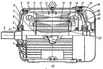 Рис. 4.1 Асинхронний електродвигун з короткозамкненим ротором: 1, 9, 17 — болти, 2 і 23 — шпонки, 3 — вал ротора, 4 и 22 — роликовий і кульковий підшипники, 5,6 — зовнішня и внутрішня кришки підшипника, 7 — стопорне кільце, 8, 21 — підшипникові щити,10 — станина, 11 — статорна обмотка, 12 — осердя статора, 13 — гвинти кріплення осердя до станини, 14 — осердя ротора, 15 — замикаюче кільце, 16 — лопать вентилятора, 18 и 20 вентилятори, 19 — кожух вентилятора