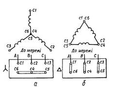 Сукупність секцій, які належать до однієї фази, називається фазною обмоткою. Виводи фаз обмотки прийнято позначати: С1, С2, С3 — початки і С4, С5, С6 — кінці відповідно першої, другої і третьої фаз. Окремі фази обмотки статора можуть з'єднуватися зіркою або трикутником. На рис. 2.3наведено схеми з'єднання фаз обмотки статора і відповідні цим з'єднанням перемикання на щитку машини.