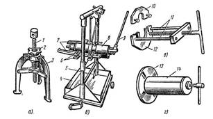 а – гвинтовий знімач з регульованим розкриттям тяг, б – гідравлічний знімач, в – знімач для стягування підшипників кочення захватом за підшипник, г - знімач для стягування підшипників кочення захватом болтами за кришки або капсули підшипника; 1 – черв’ячний гвинт з головкою, 2 – регулювальна гайка, 3 – тяги, 4 – майданчик, 5 – стійка, 6 – траверси, 7 – захвати, 8 – плунжерний насос, 9 – рукоятка штока насоса, 10 – пластинка зі штифтами, 11 – шпильки, 12 – плита, 13 – диск, 14 – корпус знімача
