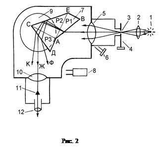 Оптическая схема монохроматора показана на рис. 2. Здесь: 1 - исследуемый источник света; 2 - конденсорная линза, предназначенная для увеличения яркости освещения щели. Ширина входной щели 3 регулируется микрометрическим винтом 4. Объектив 5 формирует параллельный пучок света и направляет его на переднюю грань призмы. Точная настройка (подвижка) этого объектива производится при помощи микрометрического винта 6. Призма Аббе 7 установлена на столике 9, который приводится во вращение барабаном 8. При помощи объектива 10 зрительной трубы изображение входной щели монохроматора формируется вблизи фокальной плоскости окуляра 12. В этой же плоскости помещен визир 11 – острие иглы. Это позволяет при визуальном наблюдении через окуляр одновременно видеть резкие изображения входной щели (вертикальные полоски света) и визира. Когда столик 9, на котором укреплена призма 7, барабаном 8 поворачивается относительно вертикальной оси, спектр также поворачивается, перемещаясь горизонтально, и в поле зрения