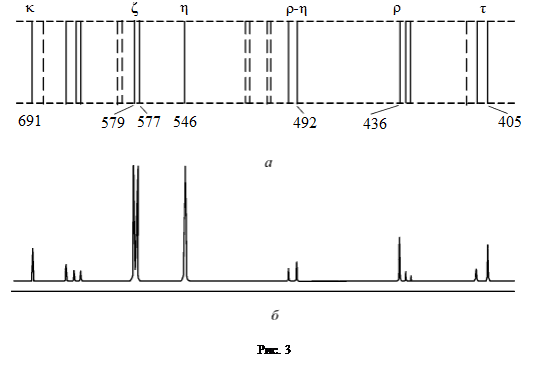 Отождествление линий в спектрах - это трудоемкая и кропотливая работа. Для ее облегчения показана схема расположения линий в спектре ртути (рис. 3 а ) и их относительные интенсивности (рис. 3 б ).