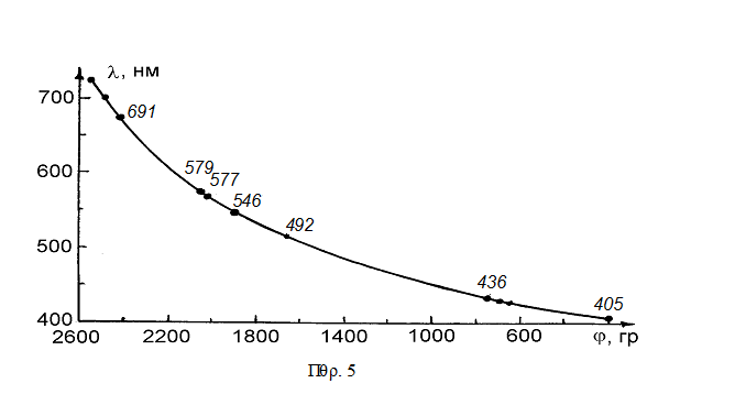 по оси абсцисс (рис. 5) откладывается в порядке убывания. Это сделано для того, чтобы точки на графике соответствовали расположению линий спектра в поле зрения трубы монохроматора. Вначале построения графика точки наносятся аккуратно остро отточенным карандашом. Если возникает разброс точек, то следует перепроверить отождествление линий на этом участке. После уточнения точки следует отметить более четко. У точек, соответствующих наиболее ярким линиям укажите длину волны. Соедините точки кривой линией. График должен представлять собой гладкую монотонную кривую, проходящую через каждую измеренную точку.