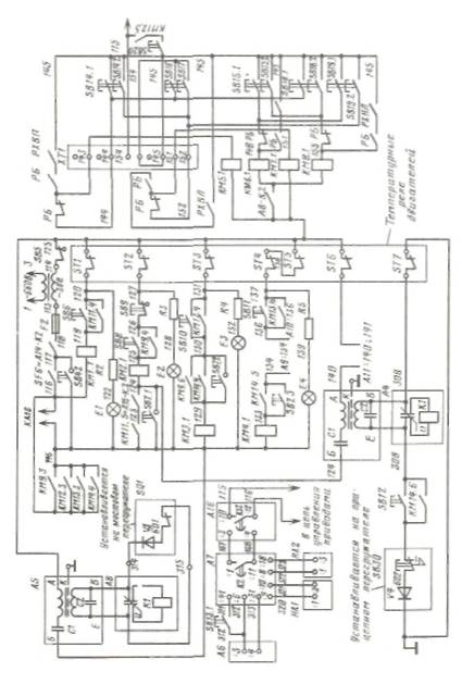 мотки электродвигателей; включение контакторов электропривода хода при работающем исполнительном органе, но выключенных перегружателях; световую сигнализацию о срабатывании защиты от токов к. з. и перегрузок; отключение станции управления при авариях; ряд блокировок исключающих возможность: включения привода исполнительного органа при проведении ремонта в его зоне, работы при нарушенной системе орошения, наезда комбайна на мостовой перегружатель при ходе «Назад»; обеспечивающих последовательность включения электроприводов, снятие напряжения со станции управления при отключении аварийного выключателя; позволяющих проверять схему станции без включения электроприводов; предусматривающих перемещать комбайн при включенном маслонасосе и освобожденных тормозных муфтах редукторов хода.