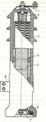 Вентильный разрядник РВП (рис. 9.14) состоит из рабочего сопротивления 5, набранного из вилитовых (тиритовых или тервитовых) дисков, основной частью которых является карбид кремния, и искровых промежутков 3, выполненных из латунныхэлектродов, разделенных слюдяными, миканитовыми или фарфоровыми прокладками. Сжатие прокладок осуществляет пружина 2. Все устройство помещено в фарфоровый корпус 4, герметизированный озоностойкой резиной 6. Для крепления разрядника служит хомут 8 с двумя отверстиями под болты. Разрядник присоединяют к токоведущему проводу пластиной 1, а к земле — с помощью шпильки 7. При номинальном напряжении в линии сопротивление вилита очень велико, и ток через разрядник не проходит. При грозовом разряде напряжение достигает огромных значений, сопротивление вилита падает и волна грозового перенапряжения проходит в землю. После спада волны перенапряжения сопротивление вилита вновь восстанавливается. Вентильные разрядники выбирают по напряжению линии, уровню электрической прочности его изоляции и наибольшему возможному напряжению между проводом и землей в месте присоединения разрядника к сети. Трубчатые разрядники выбирают по напряжению установки и предельным значениям тока к. з. в данной точке сети.