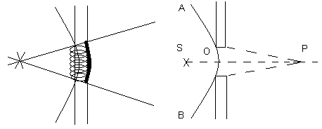 Дифракцию света Френель объяснил как результат интерференции вторичных волн согласно принципу Гюйгенса-Френеля. [Гюйгенса-Френеля принцип– это приближенный метод решения задач о распространении волн, особенно световых. Согласно принципу Гюйгенса-Френеля, каждый элемент поверхности, которой достигла в данный момент волна, является центром элементарных волн, огибание которых будет волновой поверхностью в следующий момент времени.Рис.1.Положение фронта распространяющейся волны может быть в любой момент времени представлено огибающей всех вторичных (элементарных) волн, рис.1. Источниками вторичных волн являются точки, до которых дошел фронт первичной волны в предшествующий момент времени. При этом предполагается, что вторичные волны излучаются только «вперед», т.е. в направлениях, составляющих острые углы с направлением внешней нормали к фронту первичной волны. Принцип Гюйгенса позволяет объяснить законы отражения и преломления света, однако он недостаточен для объяснения дифракционной картины.