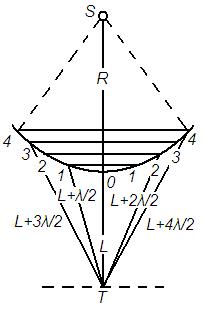 На рис. 3 показано построение зон Френеля в случае сферической волны, возбуждаемой источником S. Участок 101 волновой поверхности называется первой (центральной) зоной Френеля, кольцевой участок 21- второй зоной и т.д. Так как R и L>> λ, то при не слишком большом