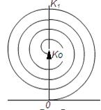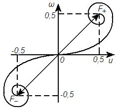 - длина волны, L- расстояние от плоскости экрана до точки Т (предполагается, что волна падает на экран нормально к его плоскости), x0 – координата точки наблюдения T, x- текущая координата точек фронта волны, а ось 0x проведена в плоскости экрана перпендикулярно к его краю. Спираль Корню состоит из двух ветвей, симметричных относительно начала координат (v=0) и при v→±∞ асимптотически навиающихся соответственно на полюс F+(0,5;0,5) и полюс F-(-0,5;-0,5).