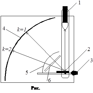 Схема прибора (прибор №1), для наблюдения дифракции света на кусочке компакт-диска, играющего роль отражательной дифракционной решетки, представлена на рисунке 2. Здесь: 1 – источник света – лазер-брелок, укрепленной на поворачивающейся планке, 2 – отражательная дифракционная решетка – кусочек компакт-диска, 3 – зажим для крепления препарата, 4 - транспортир для измерения углов дифракции, 5 – транспортир для измерения угла падения луча света, 6 – зажим для крепления поляроида.