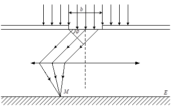Нехай на досить довгу вузьку прямокутну щілину шириною b перпендикулярно до неї падає плоска світлова хвиля. Розмістимо за щілиною збірну лінзу, а у фокальній площині екран для спостережень результатів дифракції (рис. 3).