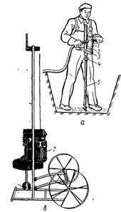 а - електросвердлом; б - заглиблювачем ЗЕ-1; 1 — шпиндель; 2 — електросвердло; 3 — редуктор; 4 — трикулачковий патрон; 5 — стержень; 6 - штанга; 7 - електродвигун