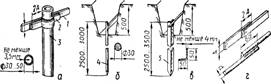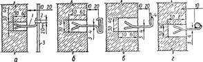 Заземлювальні провідники прокладають по будівельних елементах будинків і кріплять на опорних конструкціях (рис. 1.3, а, б, в, г). Опорні конструкції встановлюють на прямих ділянках на відстані 500—900 мм одна від одної. У разі прокладання заземлювальних провідників паралельно підлозі опорні конструкції кріплять на висоті 400—600 мм від її рівня. У місцях повороту опорні конструкції розташовують на відстані 100 мм до і після повороту, рахуючи від вершини кута, утворюваного заземлювальним провідником. Прохід заземлювальних провідників через перекриття виконують у відрізках сталевих труб, які виступають з обох боків перекриття на 30—40 мм.