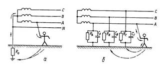 При дотику людини до струмопровідної частини в електричній мережі з ізольованою нейтраллю (рис. 3.2, б) струм буде проходити через тіло людини — підлогу (ґрунт) — ізоляцію фаз. Якщо людина доторкається, наприклад, до фази А, то її опір буде послідовно ввімкненим з опором фаз В і С. Звідси випливає, що величина струму, яка пройде через людину, буде визначатися не тільки опором людини, а й опором ізоляції.