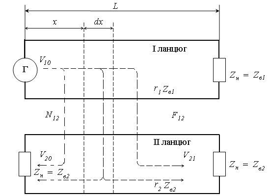 Розглянемо фізичну сутність взаємного впливу між колами, що проводять струм, з метою подальшої кількісної оцінки можливостей витоку інформації за його рахунок у колах різного конструктивного виконання (симетричними, несиметричними плоскими, коаксіальними, скрученими тощо). Візьмемо два паралельні ланцюги з довжиною паралельного пробігу