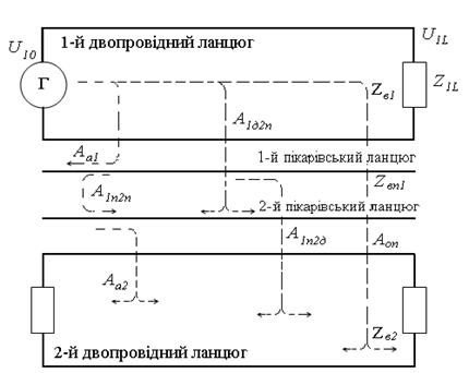 Кожний із зазначених видів впливу являє собою безпосередній вплив між взаємозв`язаними ланцюгами. Сумарне перехідне затухання між 1-м та 2-м основними ланцюгами визначається наступними видами впливу: