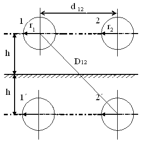 - відстань між центром 1-го провідника ланцюга і центром антиподу 2-го провідника;