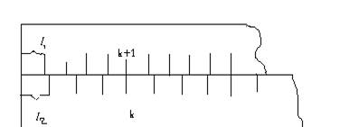 Нониус и микрометрический винт. Представимсебе две линейки, сложенные вместе, как указано на рис. 1. Пусть цена деления (длина одного деления) верхней линейки равна l1 , а цена деления нижней линейки – l2 . Линейки образуют нониус, если существует такое число k, при котором