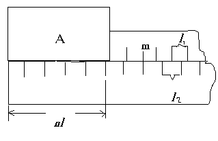 (l2 > l1 ). Здесь n – целое число делений нижней шкалы, лежащих влево от начала верхней линейки, а m - номер деления верхней линейки, совпадающего с одним из делений нижней шкалы (в том случае, если ни одно из делений верхней линейки не совпадает в точности с делениями нижней, в качестве m берут номер деления, которое ближе других подходит к одному из делений нижней шкалы).