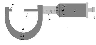 1.Измеряемый предмет (толстую проволку или металлическую пластинку) помещают между упором Е и концом микрометрического винта А .