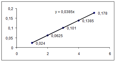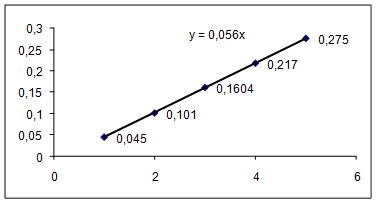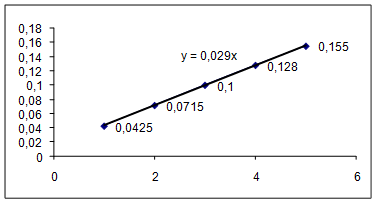 Примерное значение коэффициента наклона данного графика можно получить после его аппроксимации (усреднению квадратов значений координат точек). т.е. Ln = 0,056×n. Подставим Ln из данного выражения в формулу (17), получим, что: