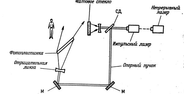 Наиболее важным требованием при получении таких голограмм является защита глаз человека от повреждения лазерным излучением. Не менее важную роль играет требование к оптическому пути опорного пучка. Необходимо предусмотреть, чтобы часть (около 10%) опорного пучка, отраженного фотографической пластинкой, направлялась в сторону от человека. Человек обычно находится на расстоянии 1—2 м от фотографической пластинки. Обычно голограммы записываются на фотопластинках Агфа 10Е75 или 8Е75 с размерами 9х12 или 18x24 см. Фотографические пластинки должны быть защищены фильтром с ограниченной полосой пропускания от засветки, вызываемой лампой-вспышкой или комнатным освещением (например, типа Schott glass RG-665). Если перед системой фильтр — фотографическая пластинка установлен затвор, то голограмма может быть получена при дневном освещении или в условиях нормального комнатного освещения, Работа такого механического затвора должна быть синхронизирована с лазером. Промышленностью выпускается электромеханический затвор, управляемый электромагнитом, с апертурой около 15 см, минимальное время открывания составляет 0,4—0,6 с. На рис. 3 показана экспериментальная установка для записи отражательных голограмм человека. В этом случае восстанавлимое с голограммы изображение можно наблюдать в белом свете. В этом случае особенно важно установить угол освещения пластинки, чтобы опорный пучок не попадал па человека.