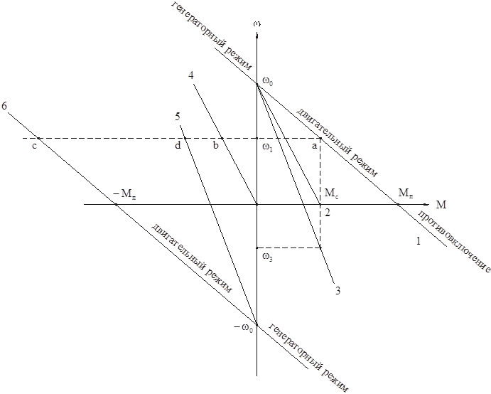 При включении двигателя без добавочного резистора (естественная характеристика - 1) груз поднимается со скоростью двигателя w1 . При включении добавочного резистора (искусственная характеристика - 2) груз не подвижен (w2 =0). При работе двигателя в режиме, определяемом характеристикой 3, груз опускается со скоростью w1 , искусственная характеристика 4 соответствует режиму динамического торможения, заключающемуся в отсоединении якорной цепи от источника и замыкании ее на добавочный резистор, характеристика 5 аналогична характеристике 2, но напряжение U=Uном , характеристика 6 параллельна характеристики 1 и соответствует во втором квадранте противовключению при подаче напряжения U=Uном .