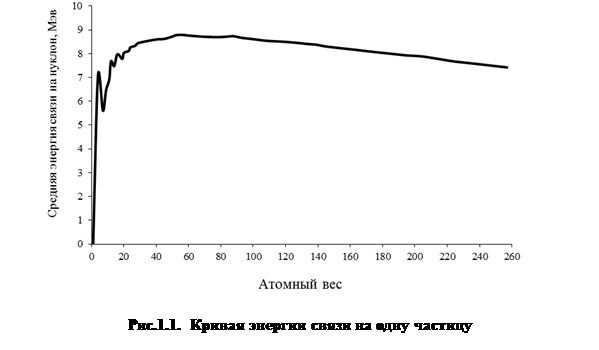 В сороковые годы ХХ века благодаря работам Астона, Демпстера и других ученых с большой точностью были определены значения дефекта массы и вычислены энергии связи для ряда изотопов. На рис.1.1 эти результаты представлены в виде графика, на котором по оси абсцисс отложен атомный вес изотопов, а по оси ординат – средняя энергия связи частицы в ядре.