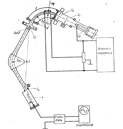 Полученные в источнике ионы ускоряются разностью потенциалов Ua =40 кв и фокусируются на входной щели S1 шириной около 13 мкм; такова же ширина щели S4 , на которую проектируется изображение щели S1 . Апертурная щель S2 имеет ширину около 200 мкм, щель S3 , на которую электростатическим анализатором проектируется изображение щели S1 , имеет ширину около 400 мкм. За щелью S3 расположен зонд, облегчающий подбор отношений Ua /Ud , т. е. ускоряющего потенциала Ua источника ионов и потенциалов анализатора Ud .