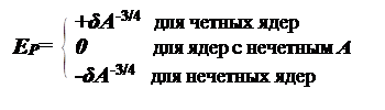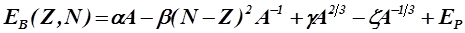 где α0 , α1 , α2 , α3 , α4 , α5 – численные коэффициенты, найденные по опытным данным для некоторых интервалов, а δ — член, учитывающий спаривание нуклонов и зависящий от четности N и Z .