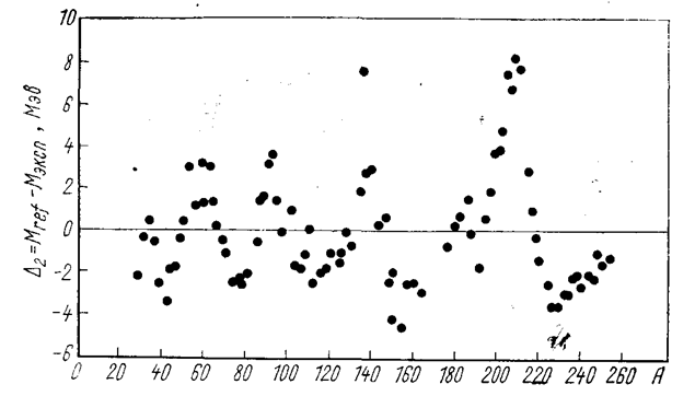 Рис. 3.2.2. Разности между значениями масс, вычисленными по основной формуле Камерона (3.2.5), и экспериментальными значениями тех же масс в зависимости от массового числа А .