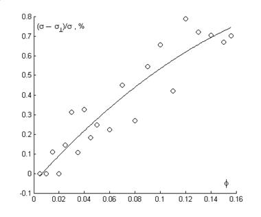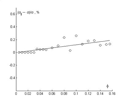 Удельная проводимость исследуемых магнитных жидкостей зависела от объёмной концентрации магнетита немонотонным образом. В области 0<φ≤0.09 проводимость росла с увеличением концентрации магнитных частиц, а в области высоких концентраций (φ>0.16) – падала. Причём графики, полученные разными экспериментаторами, расходятся. Это можно объяснить, по-видимому, температурной зависимостью электрической проводимости жидкости. Различие в значениях γ может быть обусловлено разной степенью отмывки дисперсного магнетита после его получения.