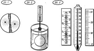 Принцип действия термометра, основанного на тепловом расширении, удобно пояснить на опыте с прибором, изображенном на рисунке 20.2. Подогревая колбу помещенную в сосуд с горячей водой, показывают, что чем дольше подогревается вода в колбе, тем выше уровень столбика воды в трубке. Если жидкость в колбе имеет температуру окружающей среды, то по высоте столбика можно также судить и о температуре этой среды (воздуха, воды).