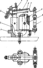 1 - силуминовое основание (заливка), служащее для сборки всего реле и как демпфер; 2- медная гильза-демпфер; 3 - отключающая пружина, регулируемая, 4 – упорная скоба с винтом; 5 - якорь; 6 - немагнитная прокладка; 7-тяга; 8 – U-образный сердечник; 9 - катушка; 10 - узел контактов
