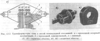 Обмотки могут выполняться из изолированного или голого медного провода. Для напряжений до 35 кВ широкое распространение получила изоляция первичной обмотки от вторичной и от заземленных деталей литым компаундом на основе эпоксидной смолы. Литой изоляционный корпус I (рис. 12-2, а) защищает первичную и вторичную обмотки от возможных механических повреждений и проникновения влаги.