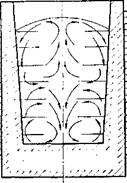 Каркас (кожух) печей небольшой емкости (<0,5 т) делают в форме прямоугольного параллелепипеда, используя асбоцемент, дерево, выполняя несущие ребра из уголков и полос немагнитной стали, дюралюминия. В местах соединения металлических элементов укладывают изоляционные прокладки для исключения возникновения кольцевых токов, Индуктор в таком каркасе крепят к верхней и нижней опорным асбоцементным плитам (рис. 3). В печах средней и большой емкости каркас выполняют из стали в виде сплошного кожуха цилиндрической формы (рис. 4) и иногда в виде «беличьей клетки», представляющей собой группу вертикальных стоек, приваренных к верхнему и нижнему опорным кольцам. Для уменьшения нагрева таких каркасов индуктируемыми токами и потерь с потоками рассеивания используют следующие решения: