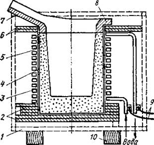 Футеровка индукционной печи состоит из следующих основных элементов: футеровки тигля, подовой плиты (подины), верхней керамики (воротника) со сливным носком. Подовая плита служит основанием для футеровки тигля и для индуктора; на средних и крупных печах ее выполняют из шамотных блоков или кирпичей, иногда на крупных печах — из огнеупорного бетона. На малых печах подовую плиту делают также из нескольких асбоцементных плит, уложенных одна на другую (см. рис. 3).