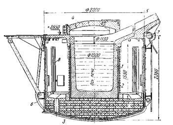 В каркасе жестко крепят индуктор, подовую плиту, верхнюю керамику, пакеты магнитопровода. К передней части каркаса на уровне сливного носка прикрепляют две цапфы, что необходимо для поворота печи при сливе металла.