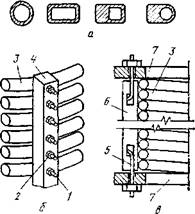 Индуктор имеет форму полого цилиндра и образован уложенными в виде спирали витками из медной трубки. Профили применяемых медных трубок показаны на рис. 5, а; равностенные трубки используют обычно для печей повышенной частоты, а разностенные — для печей промышленной частоты. Для исключения электрического пробоя витки, как правило, изолируют (на малых печах с небольшим напряжением достаточна воздушная изоляция, достигаемая зазором между витками в 10—20 мм). Широко применяют следующие виды изоляции: обмоточную, когда витки покрывают изоляционным лаком и затем обматывают лентой из диэлектрического материала (стеклоленты, микаленты); прокладочную, когда между покрытыми лаком витками закрепляют диэлектрические прокладки (например, из стеклотекстолита); напыленную, когда на поверхность трубки газопламенным или плазменным способом наносят слой окиси алюминия или двуокиси циркония с последующим покрытием лаком.