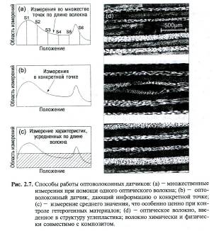 Использование оптоволоконных датчиков является одним из наиболее перспективных направлений развития интеллектуальных структур. Волоконные датчики обеспечивают новый уровень интеграции сенсорной системы и контролируемой структуры. Они позволяют объединить датчик со структурой; при этом волокно часто вводится внутрь структуры, а не на ее поверхность. К тому же оптоволоконные системы позволяют создать простую схему волоконной сети, охватывающей все изделие, что невозможно другими методами. Одно волокно может обеспечить контроль в десятках и даже сотнях точек вдоль своей длины, таким образом устранив необходимость использования сложной электронной системы связи (рис.2.7).