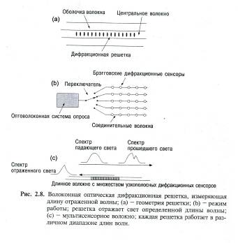 Из многих возможностей использования оптических волокон для измерений наибольшее развитие получили волоконные дифракционные решетки (ВДР.). Основная идея этой методики состоит в создании периодической решетки вдоль оси волокна. Длина решетки может достигать 10000 длин световой волны. Она приводит к интерференционным явлениям, обусловленными отражением света от ее штрихов. Ширина полосы отраженного назад сигнала обычно равна приблизительно 0,01% исходной ширины сигнала (рис.2.8). При длине световой волны 1,5 мкм расстояние между соответствующими интерференционными максимумами равно приблизительно 0,15 нм. Период решетки зависит от температуры и деформации, что приводит к сдвигу положения интерференционных максимумов. Измерение соответствующего сдвига длины волны дает простой технический метод определения периода решетки. После этого необходимо определить, обусловлено ли изменение периода решетки температурным расширением или механическими нагрузками. Для измерения деформации результаты обычно сравнивают с данными второй (контрольной) волоконной решетки, в которой в точке измерения отсутствуют напряжения. Динамические деформации измеряют исходя из изменения длины отраженной волны. При этом за период колебаний структуры не должна изменяться температура.