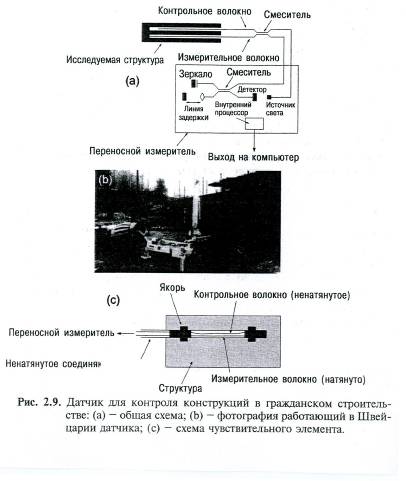 В гражданском строительстве часто необходима информация о суммарном удлинении конструкции на базе нескольких метров. Тензометр или брэгговская решетка измеряют лишь локальные удлинения. Они не дают возможности оценить всю ситуацию, так как трещины и другие концентраторы напряжения влияют на местную величину напряжения. При этом волоконные методы имеют точность порядка нескольких микрон при базе измерения в десятки метров. В Европе такие системы были установлены в нескольких тысячах зданий, и они дают информацию об изменении деформации (рис.2.9).