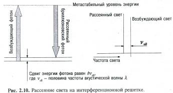 Бриллюэновская дифракция света на акустической волне является нелинейным эффектом. Главной особенностью бриллюэновского рассеяния является четкая связь между сдвигом частоты отраженной назад световой волны и длиной акустической волны. Акустическая волна представляет собой фазовую дифракционную решетку. В фазовой решетке период дифрагированной световой волны равен половине длины акустической волны (рис.2.10). Для большинства оптических волокон, работающих вблизи инфракрасного края излучения, сдвиг по частоте равен 12-15 ГГц. Из величины сдвига и длины оптической волны можно очень точно определить скорость акустической волны. Сдвиг частоты изменяется по длине волокна, и поэтому в конечном счете можно вычислить зависимость скорости звука от длины. Известно, что скорость продольной акустической волны определяется модулем Юнга, плотностью и локальной деформацией, причем первые две характеристики зависят от температуры. В результате мы получаем карту, описывающую температуру и деформацию волокна. Достоинством этой методики является то, что длина контролируемой области может достигать многих километров.