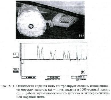 Она позволяет, например, контролировать устойчивость грунта в сейсмоопасных областях или определять степень надежности высокопрочных морских канатов, применяемых для крепежа якорей и буксировки судов (рис.2.11). Бриллюэновский зонд определяет степень поврежденния каната, что позволяет избежать его разрушения. Он также позволяет использовать якорь максимально долго, избегая дорогостоящей замены каната без особой необходимости во время планового технического обслуживания.