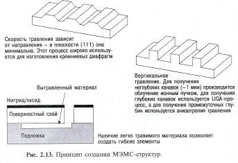 Кроме того, на скорость травления могут влиять свойства кристаллической подложки. Список способов травления можно пополнить влажным и сухим травлением, фотопроцессами и т.д. На практике получаемые травлением структуры обычно являются двумерными и имеют большую площадь в плоскости подложки при относительно небольшой толщине (рис.2.13).