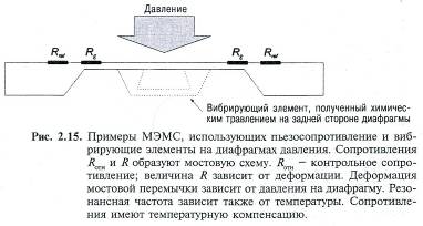 Первый широко используемый сенсор, основанный на кремниевой МЭМС, представлял собой диафрагму, на краю которой, т.е. в области больших деформаций, размещали пьезорезисторы. Во втором методе к измерительной диафрагме крепили механический резонатор в форме мостовой перемычки, как показано на рис.2.15. Изгиб диафрагмы вызывает изменение силы натяжения перемычки и, как следствие, изменение ее резонансной частоты. Это позволяет достичь более высокой точности и устойчивости работы измерительного элемента по сравнению с пьезорезисторным методом, причем технологические этапы его создания остаются практически теми же.