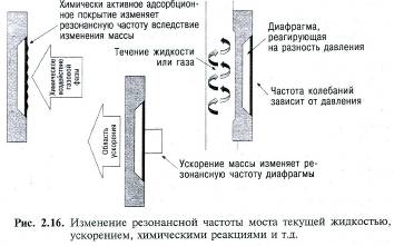 Измерением резонансной частоты вибратора (рис.2.15) можно контролировать любой внешний параметр, изменяющий силу растяжения перемычки, в том числе и температуру, поскольку различие коэффициентов теплового расширения вибрирующей перемычки и основания изменяет величину растягивающей силы. С другой стороны, при правильном выборе материалов можно практически полностью избавиться от температурной чувствительности датчика, что увеличивает точность измерения других физических параметров. При помощи такой микроструктуры можно измерять скорость струи газа, действующего на мембрану или измерительную перемычку. Кроме того, измерения можно проводить, нанося на перемычку химически активное покрытие, изменяющее ее размеры или массу под действием химических реакций или адсорбции.