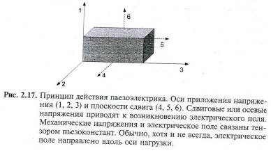 В датчиках из пьезоэлектрических материалов напряжения или деформации приводят к появлению электрического заряда на двух поверхностях, что проявляется в виде разности электрического потенциала (рис.2.17). Наиболее широко применяют циркониевые и титановые пьезоэлектрические керамики. На втором месте стоят пьезоэлектрические полимеры, как правило ПВДФ. Кроме них, используют пьезоэлектрики из титаната бария, ниобата лития и окиси цинка.